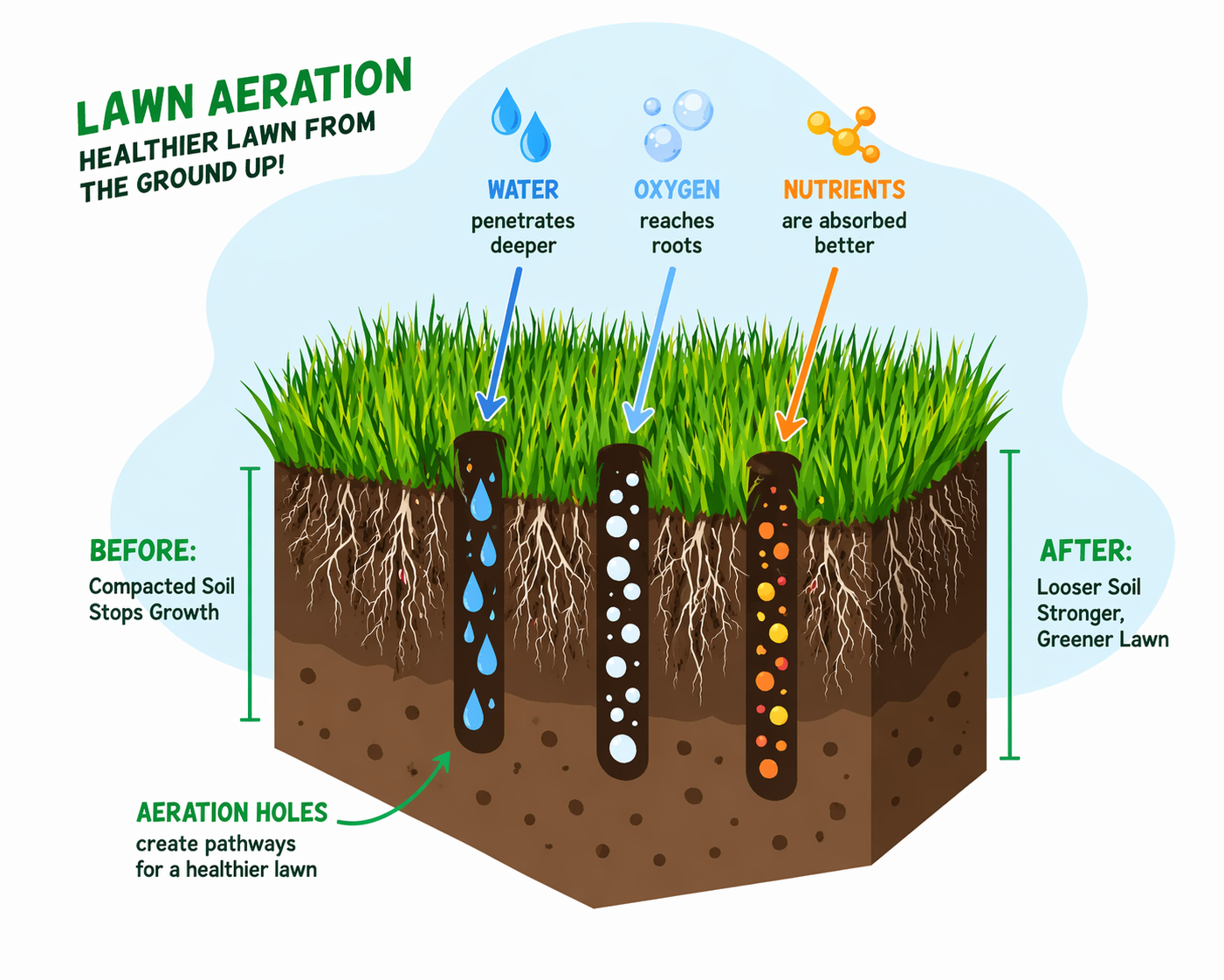 People aerate their lawn for several important reasons. Over time, soil becomes compacted, which makes it difficult for roots to grow and thrive. Aeration loosens this tight soil, allowing the root system to expand more easily. It also improves water absorption, so moisture can reach deeper into the ground instead of running off the surface. By creating space in the soil, aeration increases oxygen flow, helping roots “breathe” and promoting overall lawn health. In addition, it helps break down thatch buildup and allows fertilizers and nutrients to penetrate the soil more effectively, reaching the roots where they’re needed most.